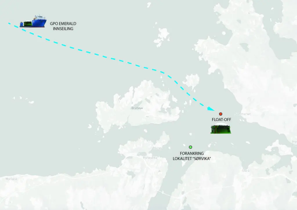 Søndag 23. november ble Storbåtsegga dratt av frakteskipet GPO Emerald i nydelig vintervær. En stor synkronisert operasjon som var planlagt til minste deltalj.